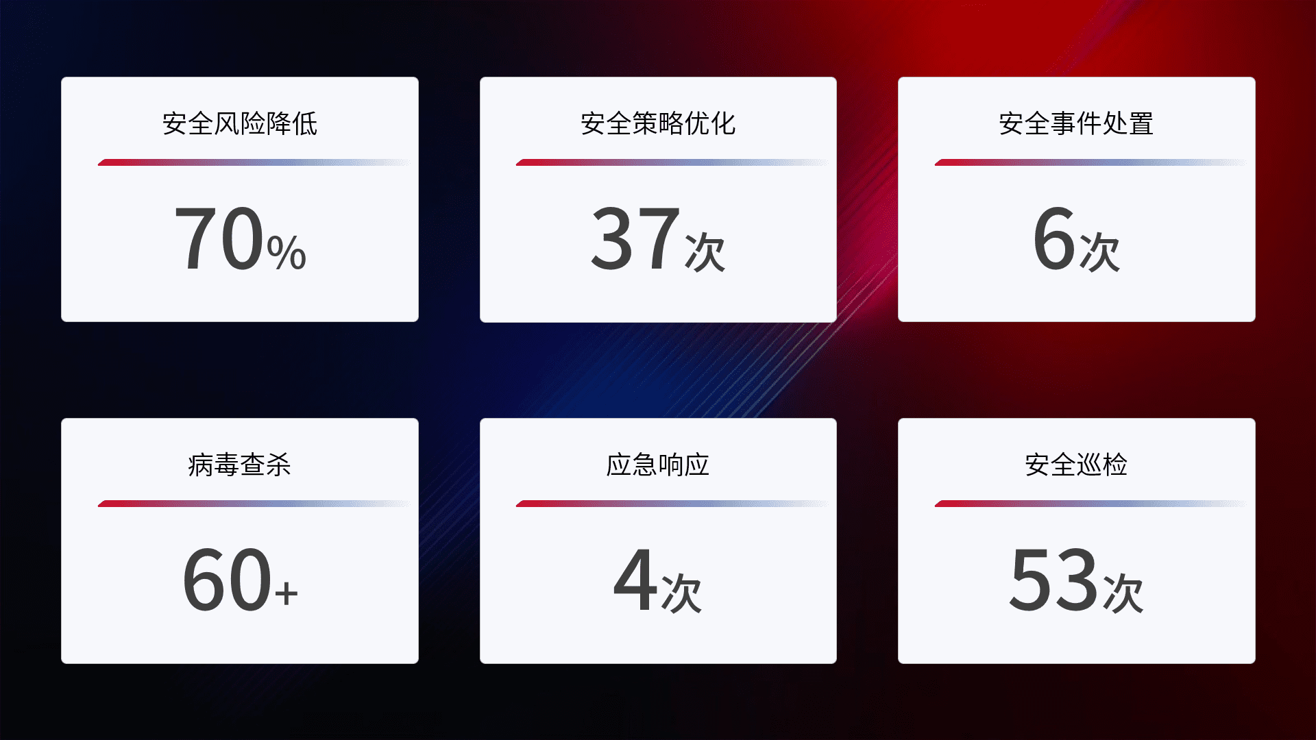 提供全面的安全事件报告体系,,,,包括处置报告、、、周报、、、季度和年度总结,,,,结合持续监控,,帮助客户深入了解网络安全状况。。。